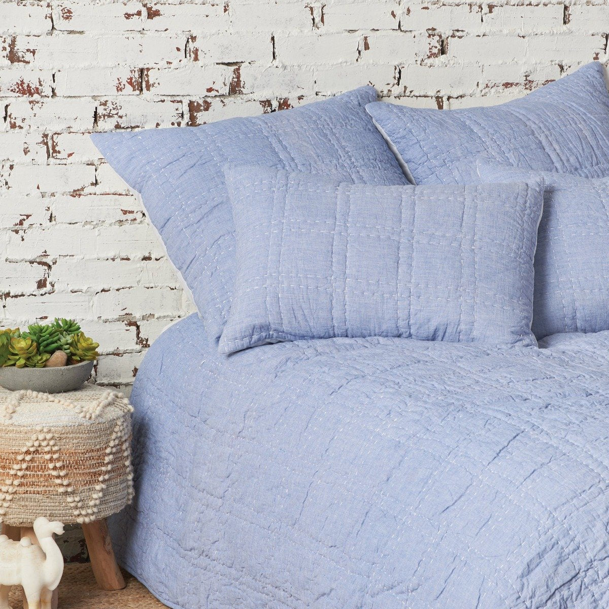 Hugh’s favorite activity? Sitting on the porch swing. sipping ice cold lemonade on a warm summer day. Hugh features a soft chambray front in a dreamy soft blue and reverses to classic white cotton voile. Use Hugh as your foundation for bright and bold bedding and accessories. or simply toss a few white pillows onto your bed to add some fluffy clouds to your stratosphere. Really. the sky’s the limit. And if you’re not ready to drift off just yet. then Hugh’s featured hand-stitched quilting will keep you down-to-earth.